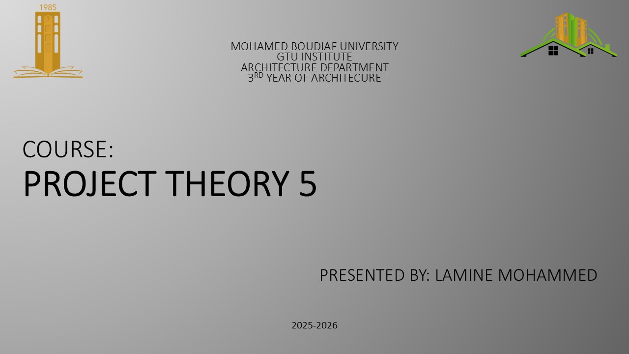 Project Theory 5 (Théorie de Projet 5) is a fundamental, 5th-semester course designed to bridge abstract theoretical knowledge with concrete design methodology, preparing students for advanced studio practice. The course is structured around a four-phase conceptual arc: beginning with the phenomenological understanding of Lived Space, transitioning into the Cognitive Process of Creation , and formalizing the abstract idea into the strategic Parti. The final phase focuses on Organization and Critique, teaching students the geometric rules of Spatial Organisation (Axis, Grid, Hierarchy) and the Tectonic articulation of elements, while critically examining the ideological drivers and the socio-spatial dialectic between conceived space and lived space. The core objective is to equip students with the conceptual tools and critical thinking frameworks necessary to translate intuitive intentions into coherent, structured, and methodically informed architectural solutions.