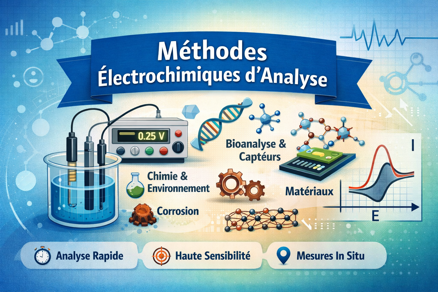 Les méthodes électrochimiques d’analyse sont des techniques basées sur l’étude des phénomènes électriques liés aux réactions d’oxydoréduction à l’interface électrode/solution. Elles permettent l’identification et la quantification d’espèces chimiques avec une grande sensibilité, une bonne précision et une instrumentation simple. Largement utilisées en chimie analytique et industrielle, en analyse environnementale, en corrosion, en bioanalyse et en électrochimie des matériaux, ces méthodes se distinguent par leur rapidité, la possibilité de mesures in situ et une faible consommation d’échantillon. Ce cours vise à donner à l’étudiant les bases nécessaires pour comprendre leurs principes, choisir la méthode adaptée et interpréter des résultats électrochimiques simples.