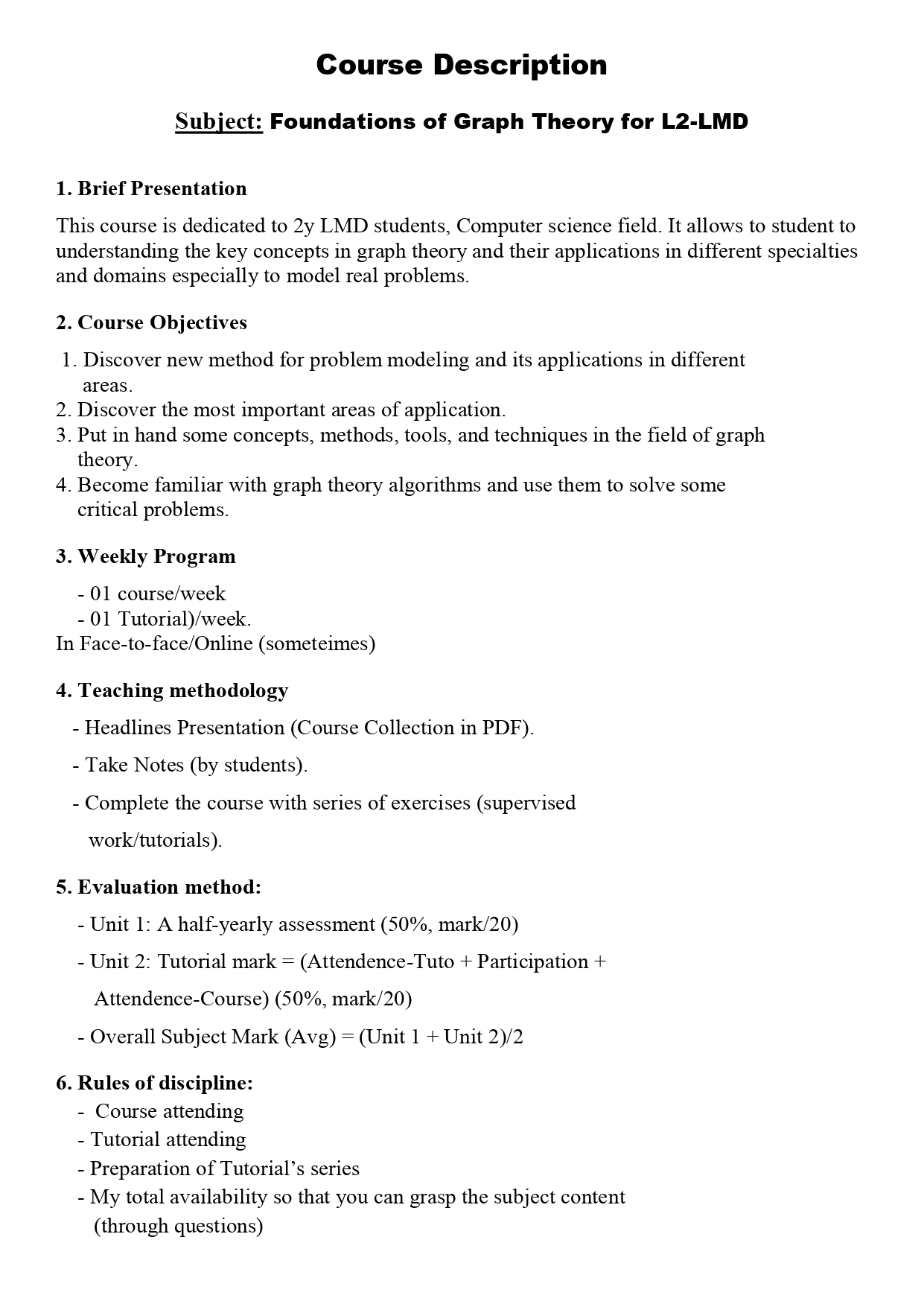 This course is dedicated to 2y LMD students, Computer science field. It allows to student to understanding the key concepts in graph theory and their applications in different specialties and domains especially to model real problems.