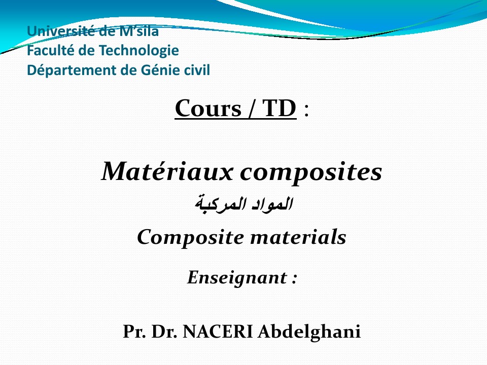 - Connaitre quelques techniques d'homogénéisations et le comportement mécanique des matériaux composites.