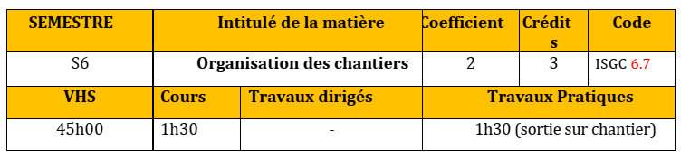 Acquisitions des connaissance théoriques nécessaires pour l'organisation d'un chantier, ainsi la planification des travaux et les taches dues pour la réalisation du projet de construction;